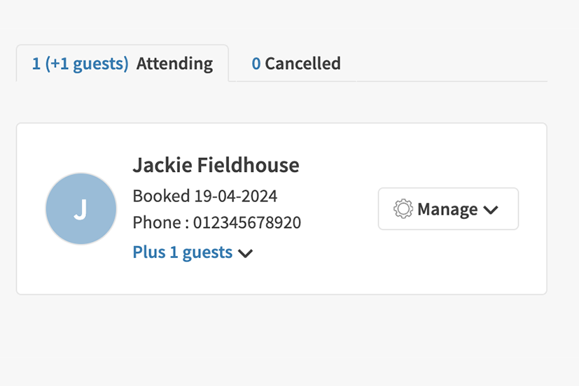 • Your attendees are listed in rows below. The member who booked them will display as the contact, with the date that they booked, their phone number and information about how many guests they have booked to bring with them.